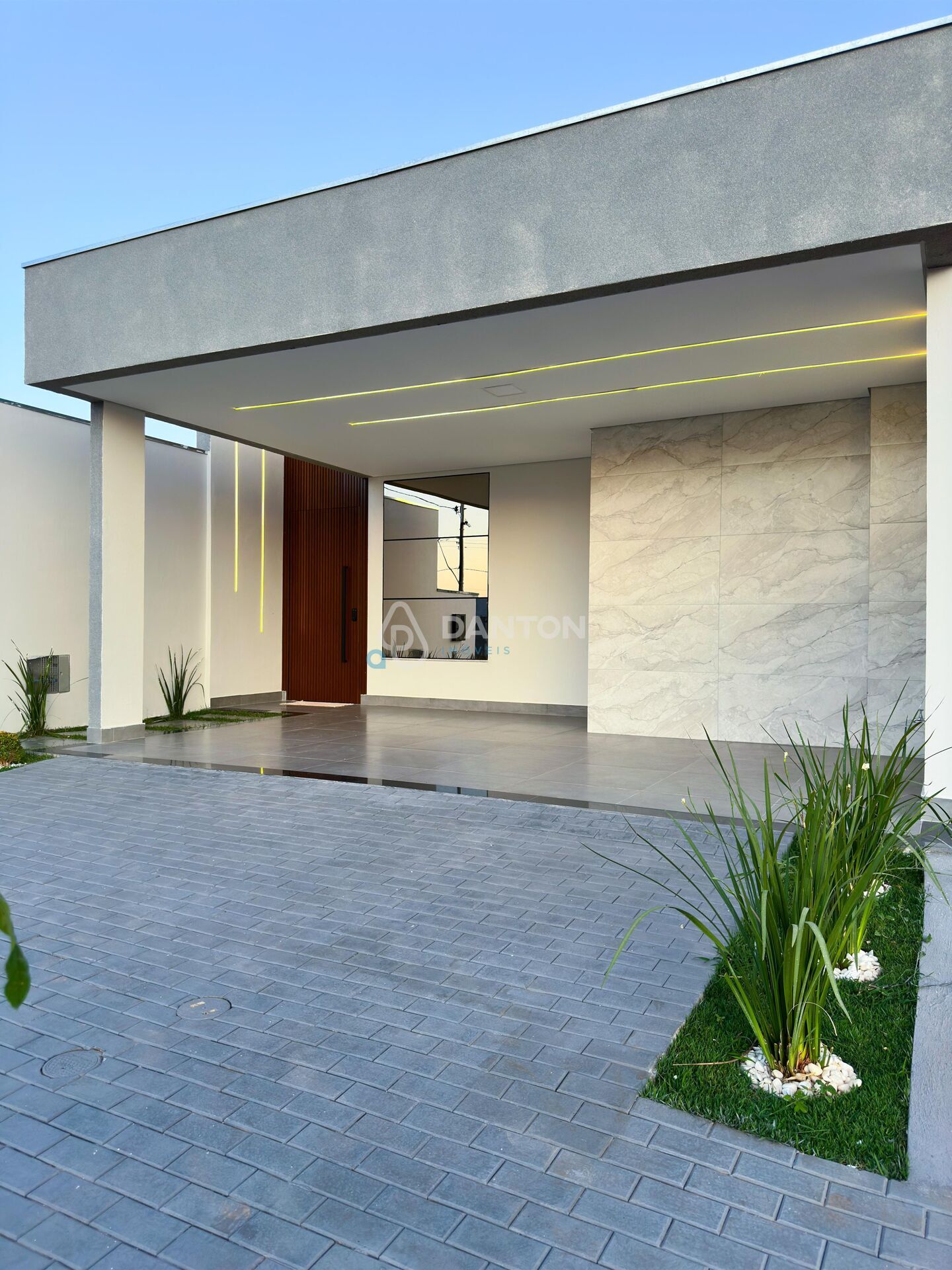 - Porta de entrada em alumínio ripado com fechadura eletrônica para maior segurança e modernidade.